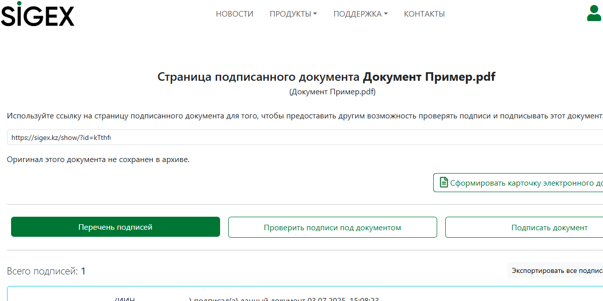 На странице подписанного документа можно ознакомиться с информацией о том, кто и когда подписывал данный документ, проверить зарегистрированные подписи, добавить новые и сформировать карточку электронного документа.