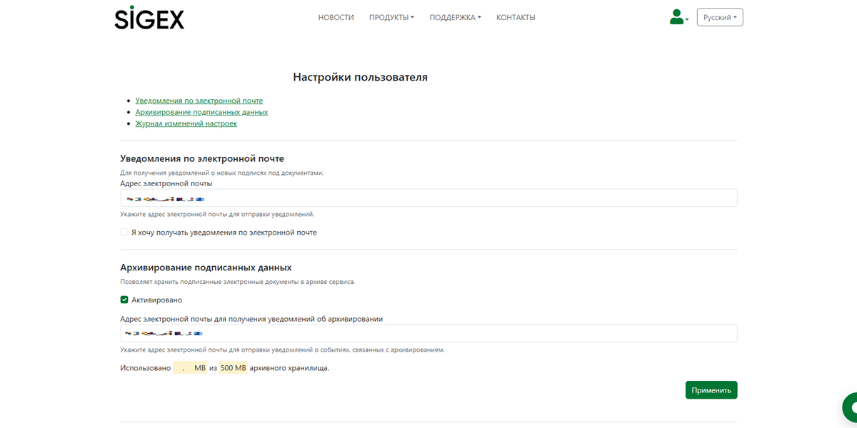 В данном подразделе можно включить уведомления о новых подписаниях под документами и указать адрес электронной почты на который эти уведомления будут приходить.